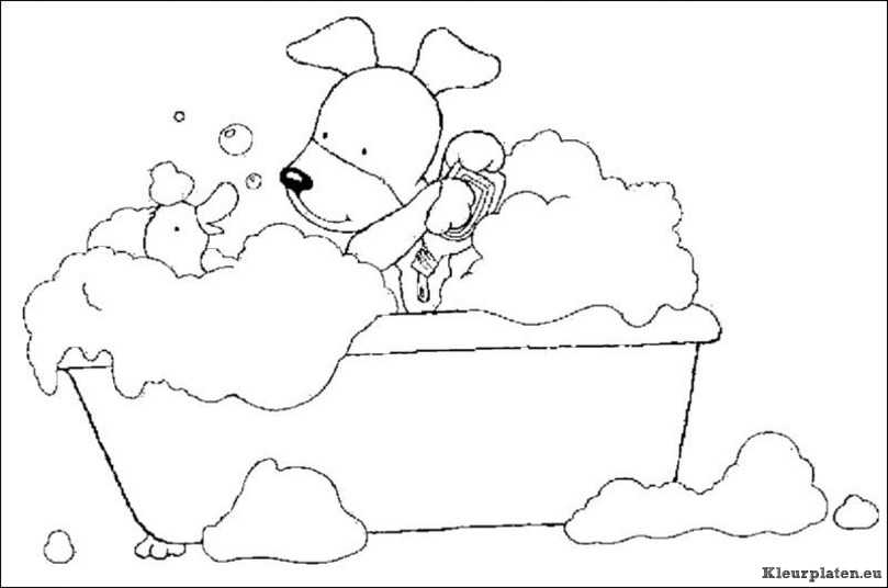 Hondje speelt in bad met eendje kleurplaat