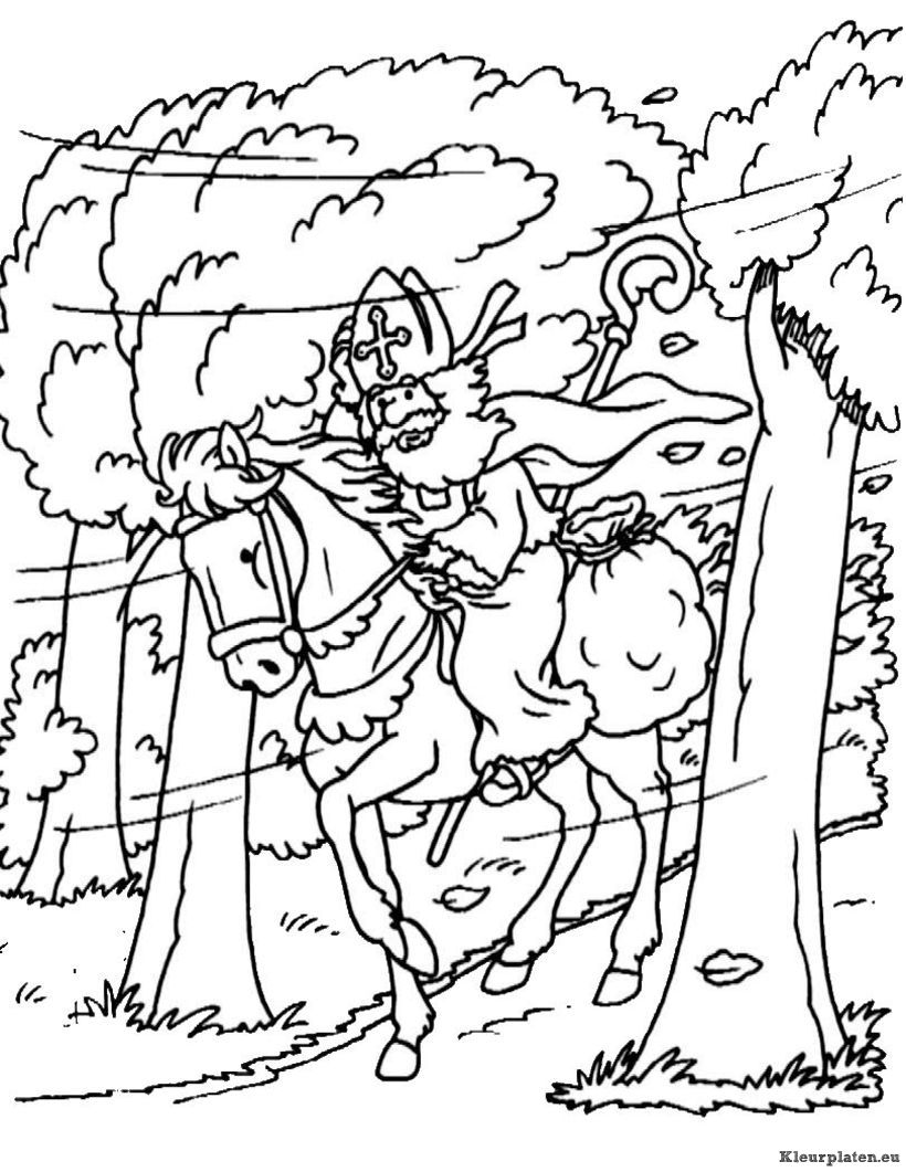 Sinterklaas in wind op zijn paard kleurplaat