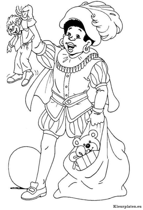 Zwarte Piet met de zak van Sinterklaas vol pakjes kleurplaat