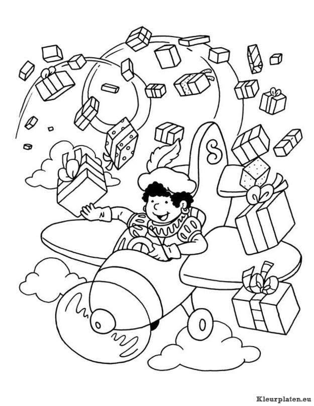Zwarte Piet strooit pakjes uit vliegtuig kleurplaat